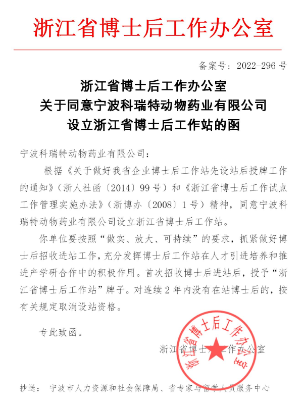 日前,寧波科瑞特動物藥業(yè)有限公司獲浙江省博士后工作辦公室批復,同意寧波科瑞特設立省級博士后工作站。